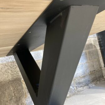 The oak dining table has a very high quality finish. So there is always one at the bottom iron frame milled to prevent settlement and deformation. Depending on the length, 2 or 3 profiles. The thickness from the oak table top 40mm. The legs are welded, sanded and painted matt black. The welds are, in contrast to cheaper alternatives, so no longer visible, which makes it very sleek and modern.