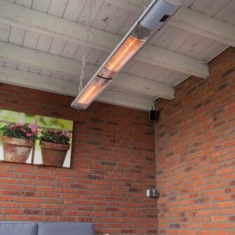 Due to the powerful power, the remote control, the three adjustable positions and the installation on the wall or on the ceiling, this infrared patio heater is extremely suitable for indoor and outdoor use. You can use it on a terrace, in a pool house or porch. But it also serves well on a catering terrace as an infrared heater above a table, for example.