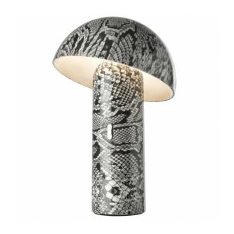 Lampe de table design Svamp avec tête inclinable. Lampe d'ambiance en différentes couleurs et imprimés pour une utilisation à l'intérieur sur une table ou une armoire comme lampe d'ambiance. Très belle lampe design en plastique, disponible en noir, blanc, gris ou un imprimé en carbone, serpent ou panthère. Facile à utiliser, longue durée de combustion jusqu'à 24H dans le réglage de lumière le plus bas.