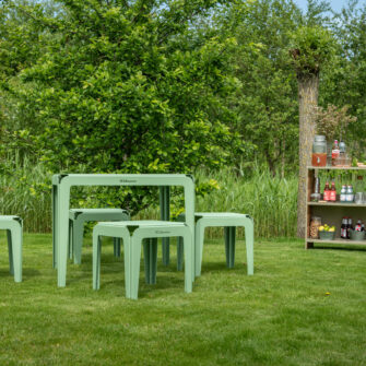 La chaise Bended en vert ou bleu est en aluminium. En raison des côtés plissés à 45°, cette chaise a le même beau design que la table de jardin et le banc de jardin au design courbé. Grâce à l'utilisation de l'aluminium, les chaises sont très légères (seulement 3,5 kg) et donc faciles à déplacer dans le jardin.