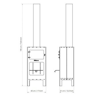 - De afmetingen van de kachel met pizza oven : H 190 (inclusief rookkanaal) x W 44 x D 33 cm