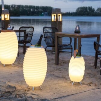 In naam Synergy wijnkoeler verwijst naar de multifunctionele eigenschappen als sfeerlamp, ijsemmer / champagne koeler en als bluetooth speaker. Hierdoor kan je genieten met vrienden of familie aan het zwembad of in het poolhouse van een heerlijk fris drankje, een prachtig design sfeerlicht en een streepje muziek.