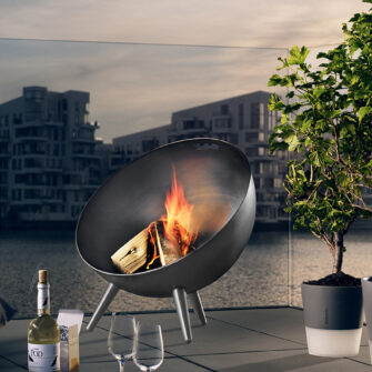 Over deze vuurschaal is nagedacht! Het ontwerp is werkelijk vernuftig. Het zwarte staal is stijlvol en functioneel. De losse rooster zorgt voor een goede zuurstof toevoer en een grote vlam. Aan de bovenkant is een opening die dienst doet als handvat en deze Fireglobe vuurschaal gemakkelijk verplaatsbaar maakt. De poten zijn gemaakt van Aluminium en dus onverwoestbaar. De hoogte van de vuurschaal zorgt er voor dat het gras niet verschroeit onder de vuurschaal. Ook het terras zal niet beschadigd worden onder deze vuurschaal. De rechtopstaande vorm zorgt enerzijds voor een zeer goede reflectie van de warmte naar voor + beschermt de vlammen tegen de wind.